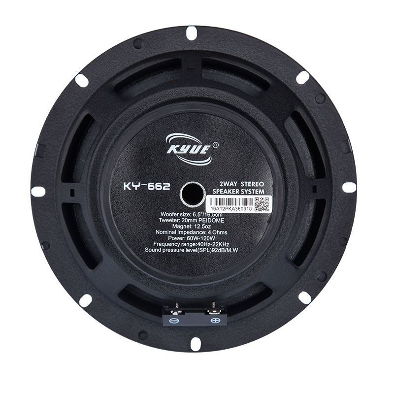 Model:KY-662 (6.5) 2-way component speaker Power:60-120W Tweeter :20mm Silk DOME Voice Coil:25.5mm Nominal Impedance Ohms :4 Maghet:11 oz Frequency Range:40Hz-22KHz Sensitivity:92db Material(cone):PP and sheep wool